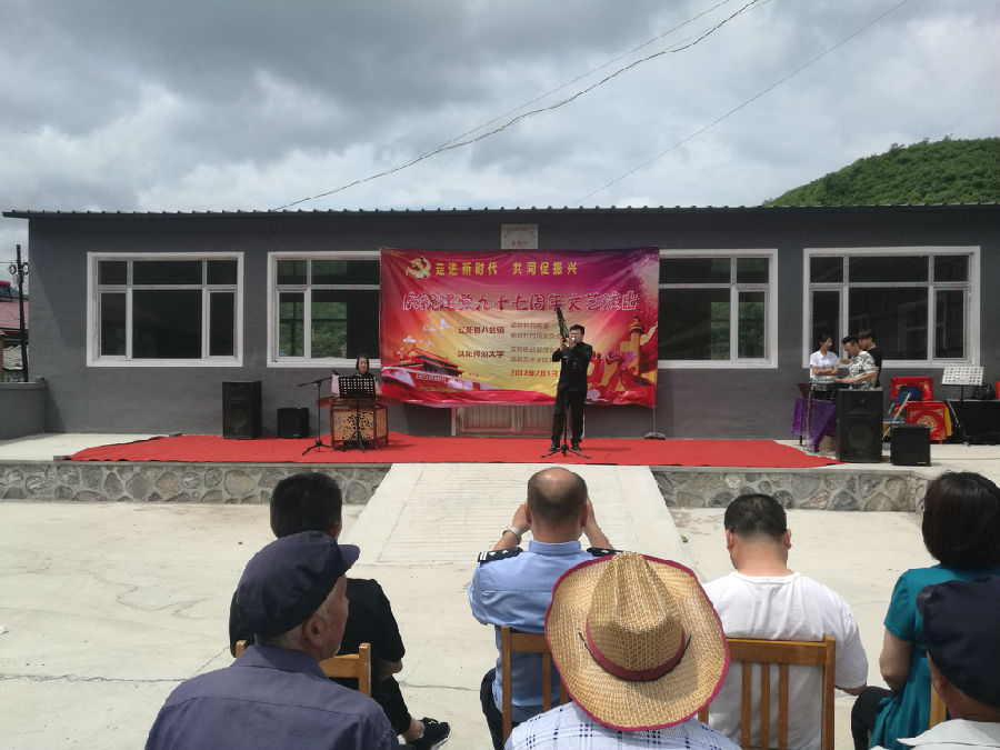 7月1日早6点,全体参演师生满怀热情前往辽阳市辽阳县榆树村,上午十时三十分演出正式开始,整台演出主题鲜明,内容明确。是一台涵盖民族器乐、舞蹈、戏曲、曲艺等综合性艺术形式的晚会。晚会中有描写美好农村生活、展示普通民众用自己的勤劳双手创造幸福的笙独奏《算盘响》、唢呐独奏《山村来了售货员》;有反映抗日战争时期,与日寇不屈不挠斗争、为国抛头颅洒热血的革命前辈们英雄故事的现代戏《红灯记》、《智取威虎山》《绣红旗》等;也有描写人生充满希望,反映新时代对新生活美好憧憬的独舞《往日时光》,由公司曲艺社表演的相声《铃铛谱》更是带给村民无限的喜悦和欢乐,整场晚会在热情、欢乐、祥和的氛围下圆满落幕。